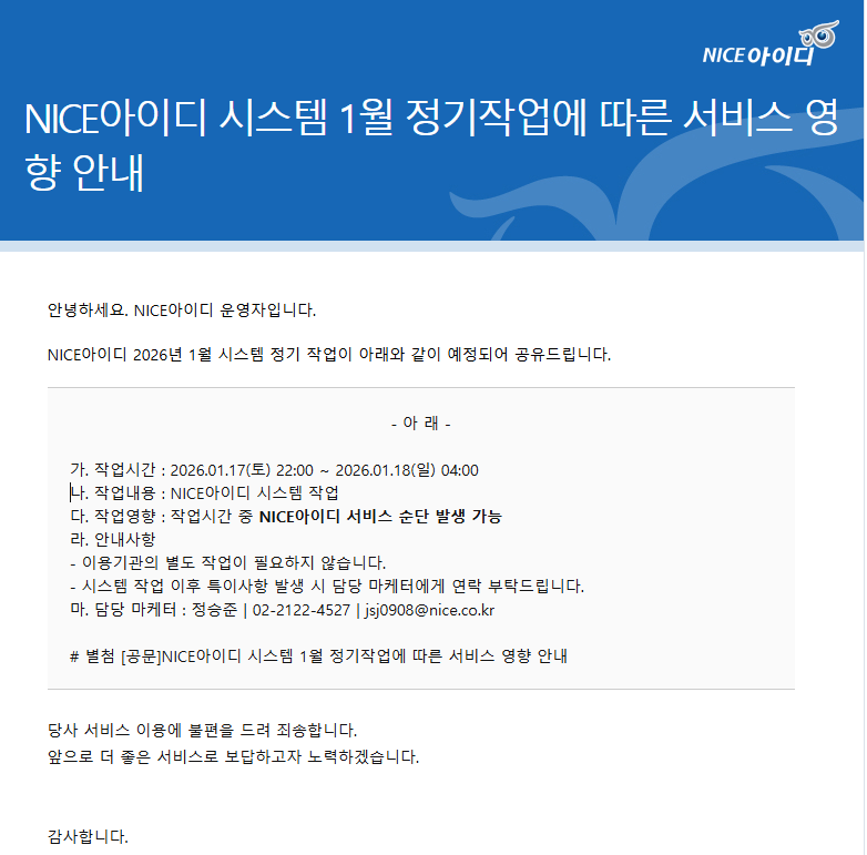 NICE¾ÆÀ̵ð ½Ã½ºÅÛ 1¿ù Á¤±âÀÛ¾÷¿¡ µû¸¥ ¼ºñ½º ¿µÇ⠾ȳ»(26.1.17~18)